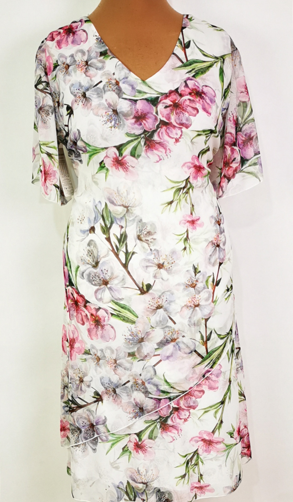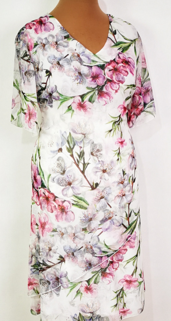 "V" nyakú, lepke ujjú, dupla anyagú, hátul cipzáras, fehér alapon, nagy, színes, virág mintás, alkami, muszlin ruha. 1-2 cm-t enged.