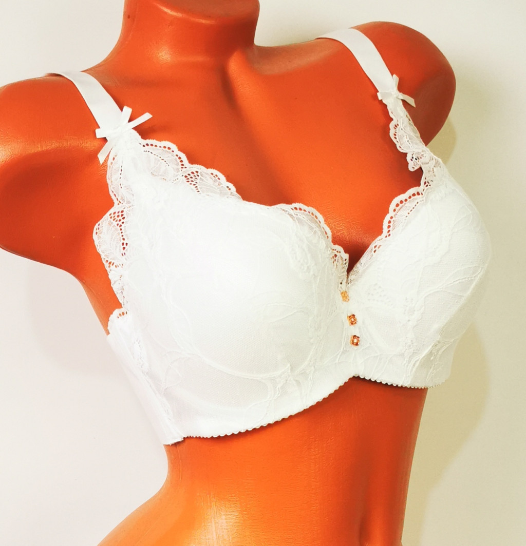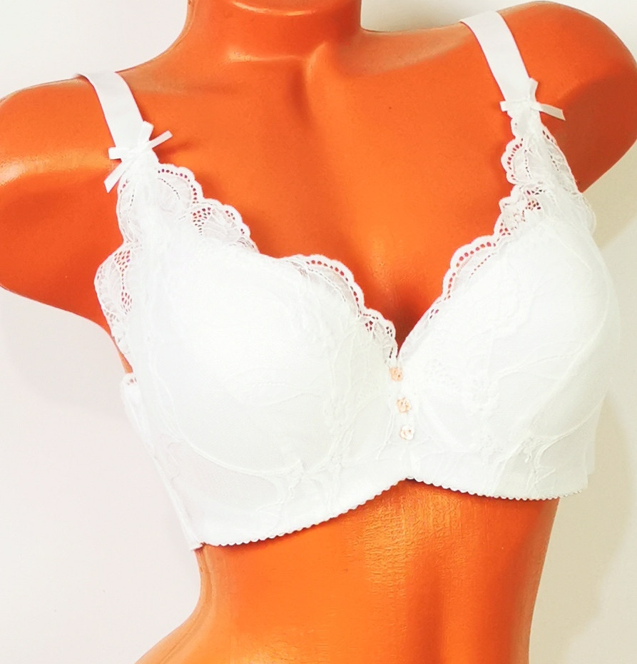 Fehér színű, széles pántos, 3 kapcsos, vékony szivacs betétes, merevítős, csipke díszítéses melltartó.