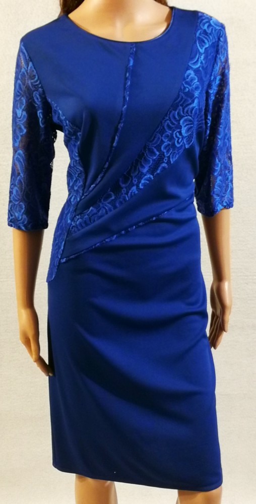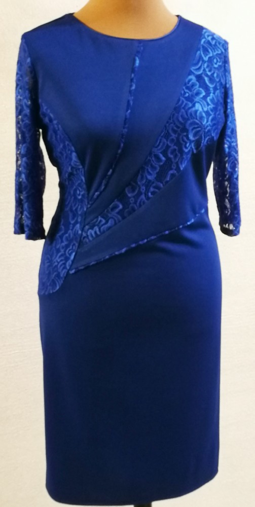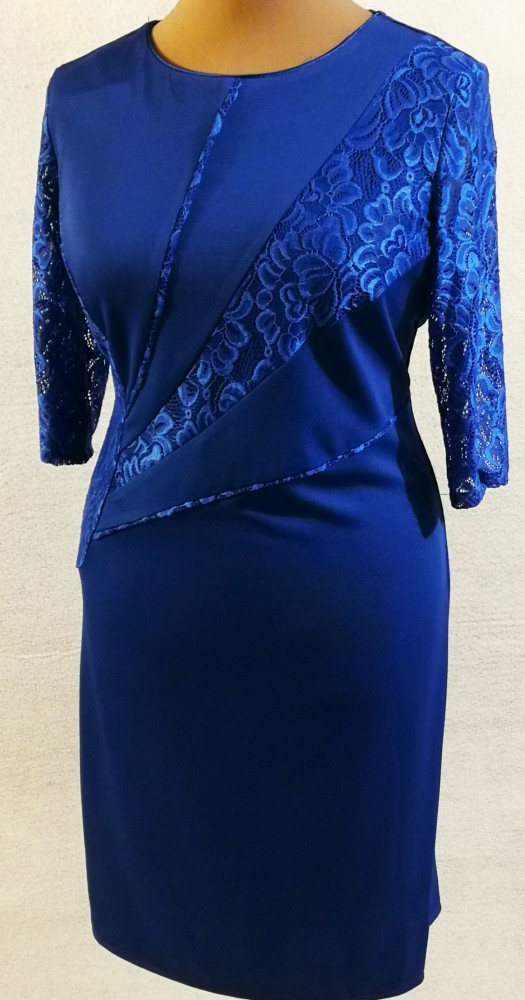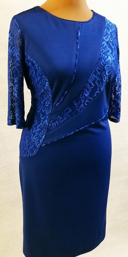 Kerek nyakú, 3/4-es csipke ujjú, hátul felsliccelt, elől nagyon szép csipke betétes, karcsúsított, kellemes, selymes anyagú, alkalmi ruha. 5-6 cm-t enged.