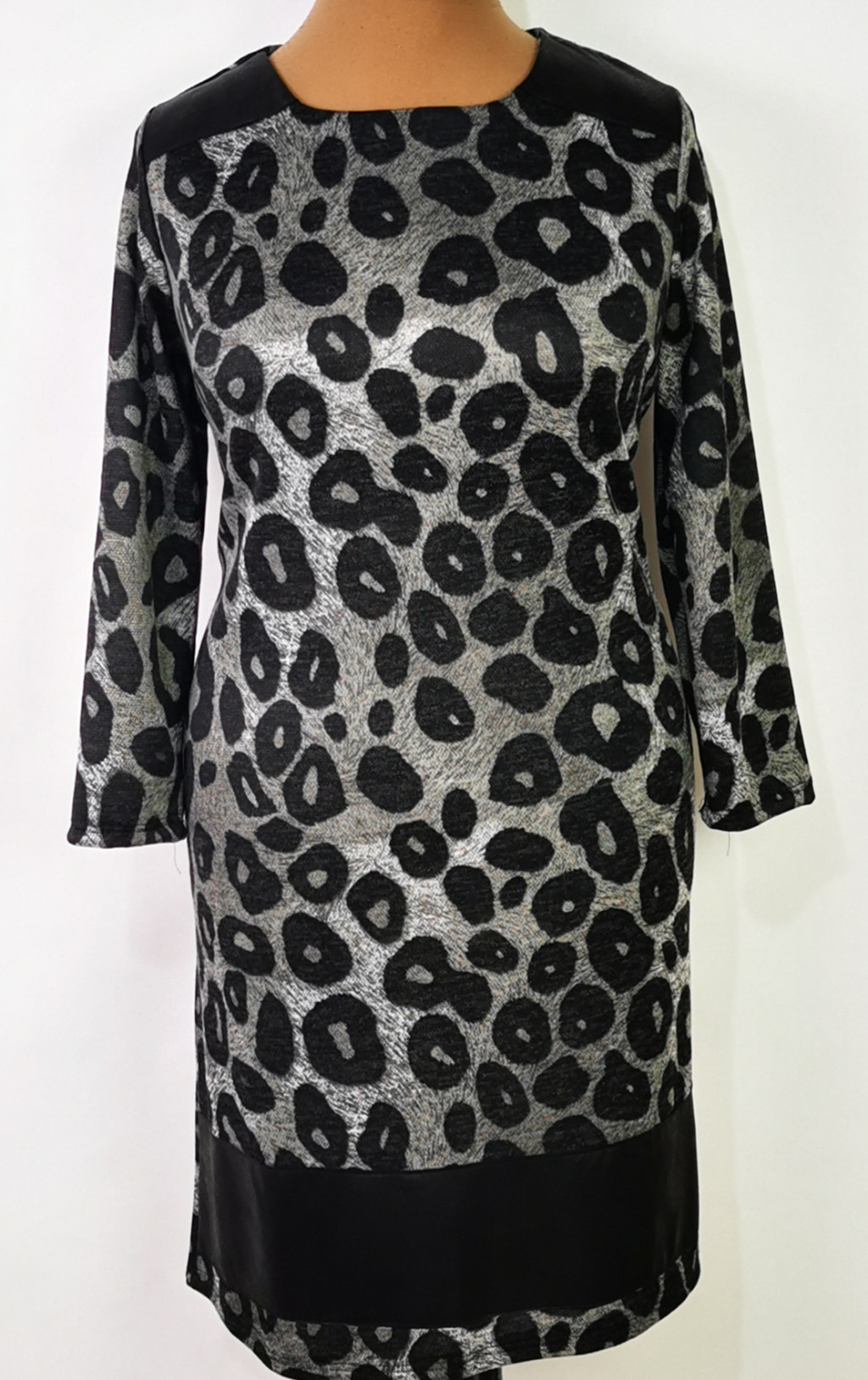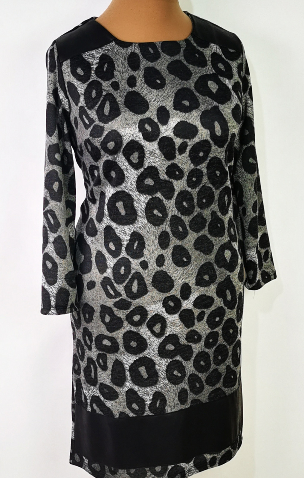 Kerek nyakú, 3/4-es ujjú, szürke-fekete mintás, alsó része latex betétes, pamutos anyagú ruha. 5-6 cm-t enged.