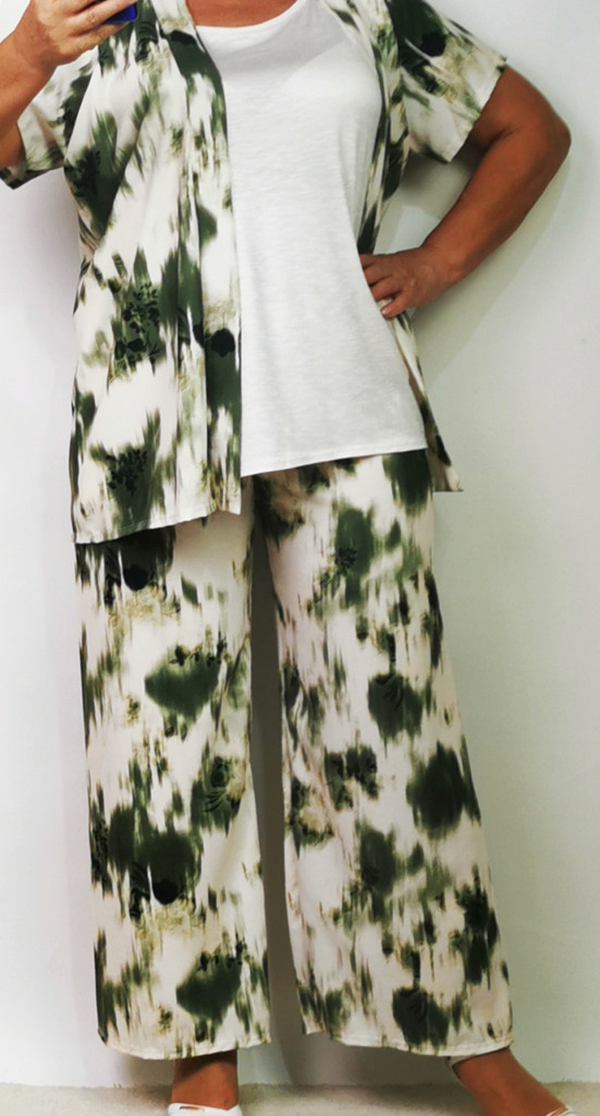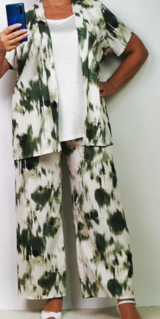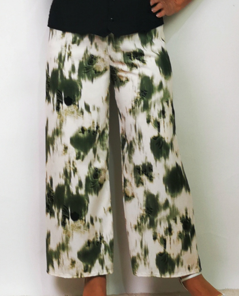 Bő szárú, gumis derekú, krém-zöld színű, pamutos anyagú nadrág.
