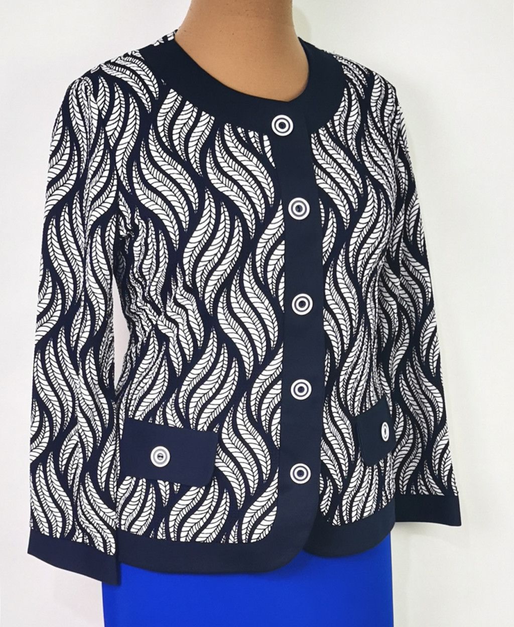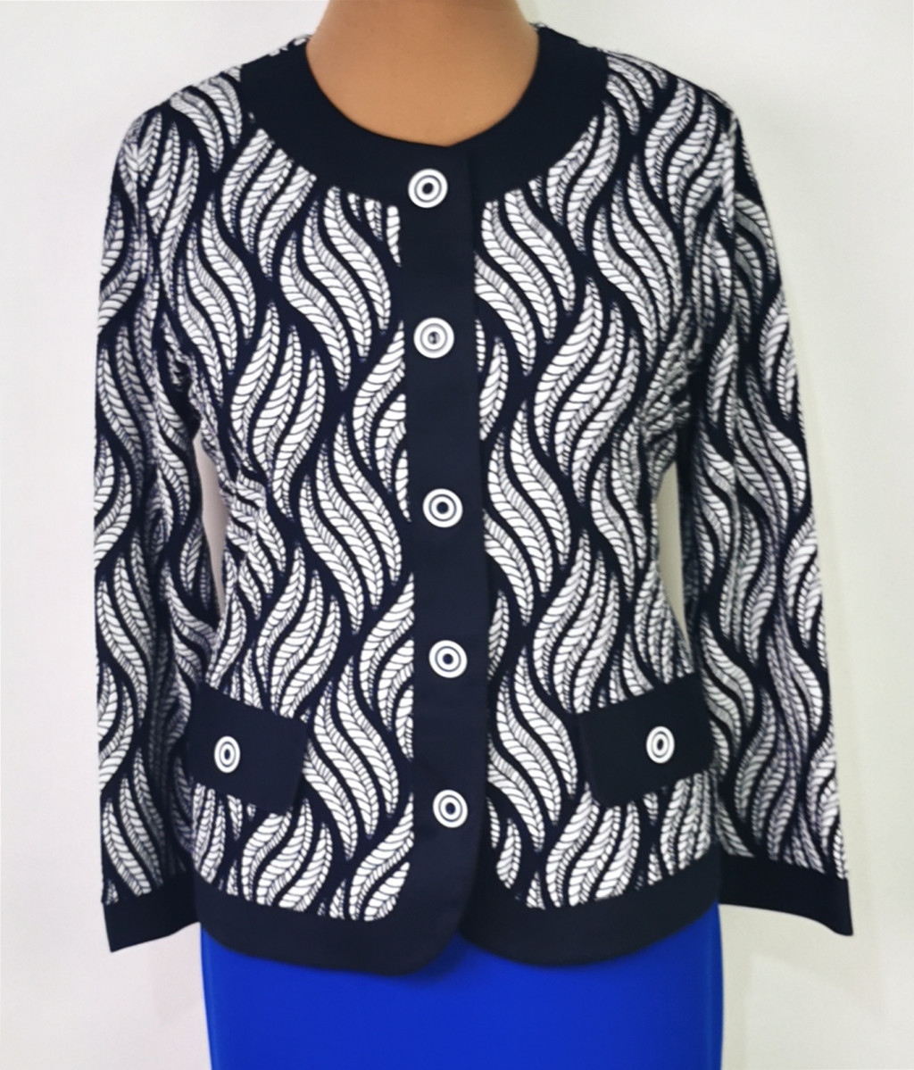 Fehér-sötétkék mintás, hosszú ujjú, elől végig gombos, sötétkék színű álzsebbel és szegővel díszített, alkalmi blézer. 2-3 cm-t enged.