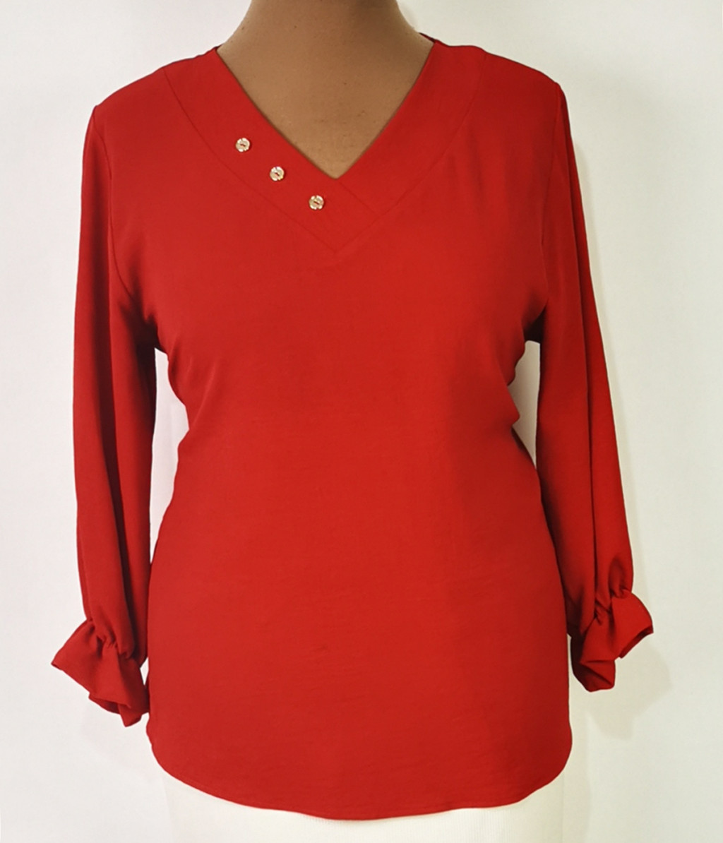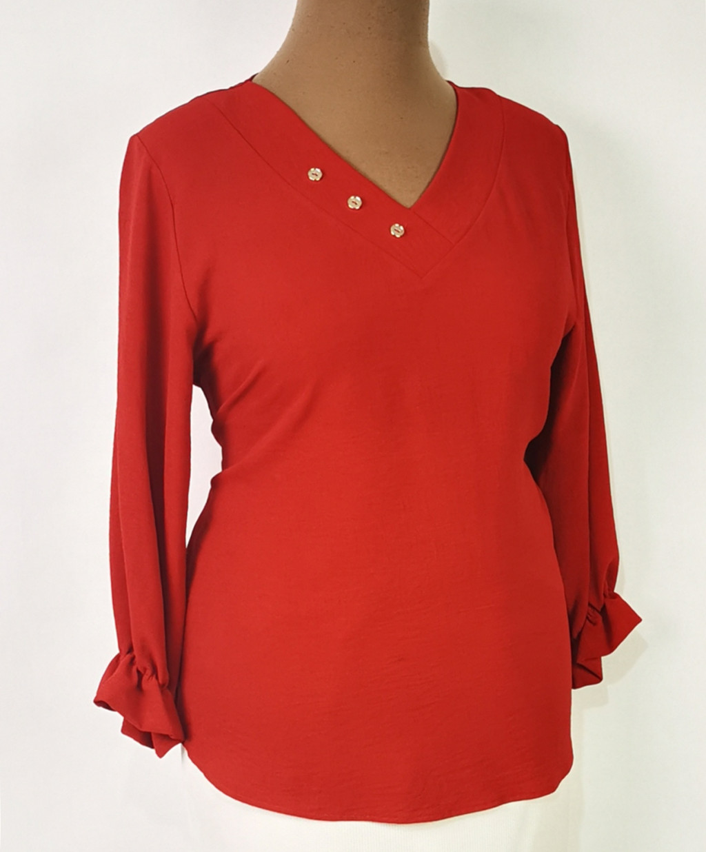 "V" nyakú, 3/4-es ujú, piros színű,, nyaknál díszített, selymes, anyagú, alkalmi felső. 1-2 cm-t enged.