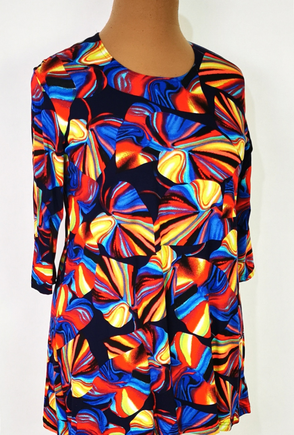 Kerek nyakú, 3/4-es ujjú, színes mintás, kellemes, rugalmas, pamutos anyagú tunika. 4-5 cm-t enged.